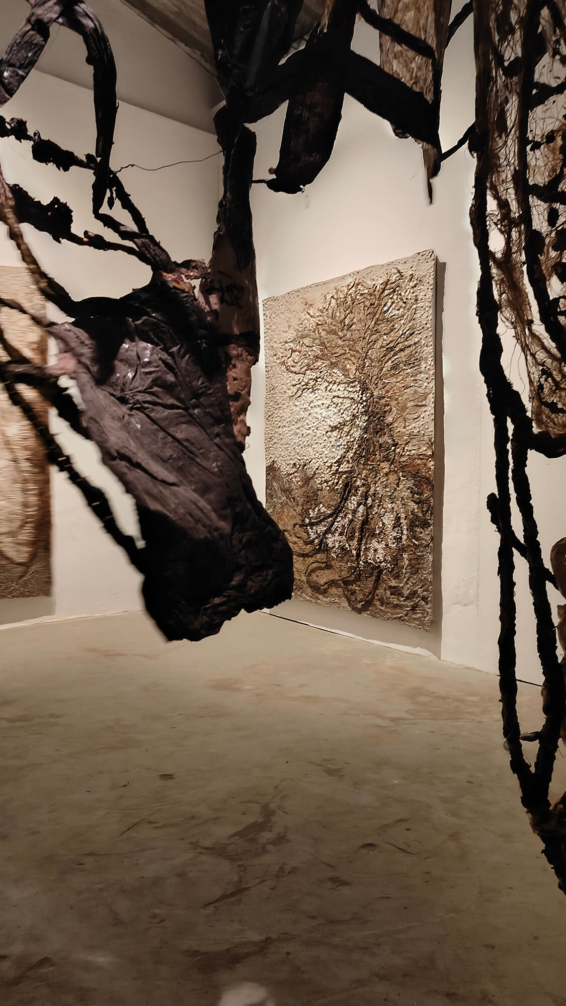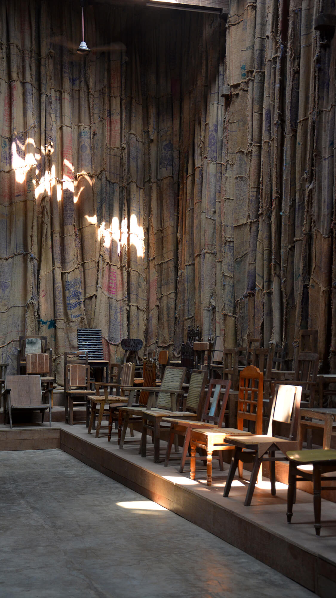 At Anand Warehouse, an installation titled “Parliament of Ghosts” by Ibrahim Mahama, created with old jute sacks and sourced vintage chairs, stood as an impressive evocation of the common man’s power in dialogue and unity.