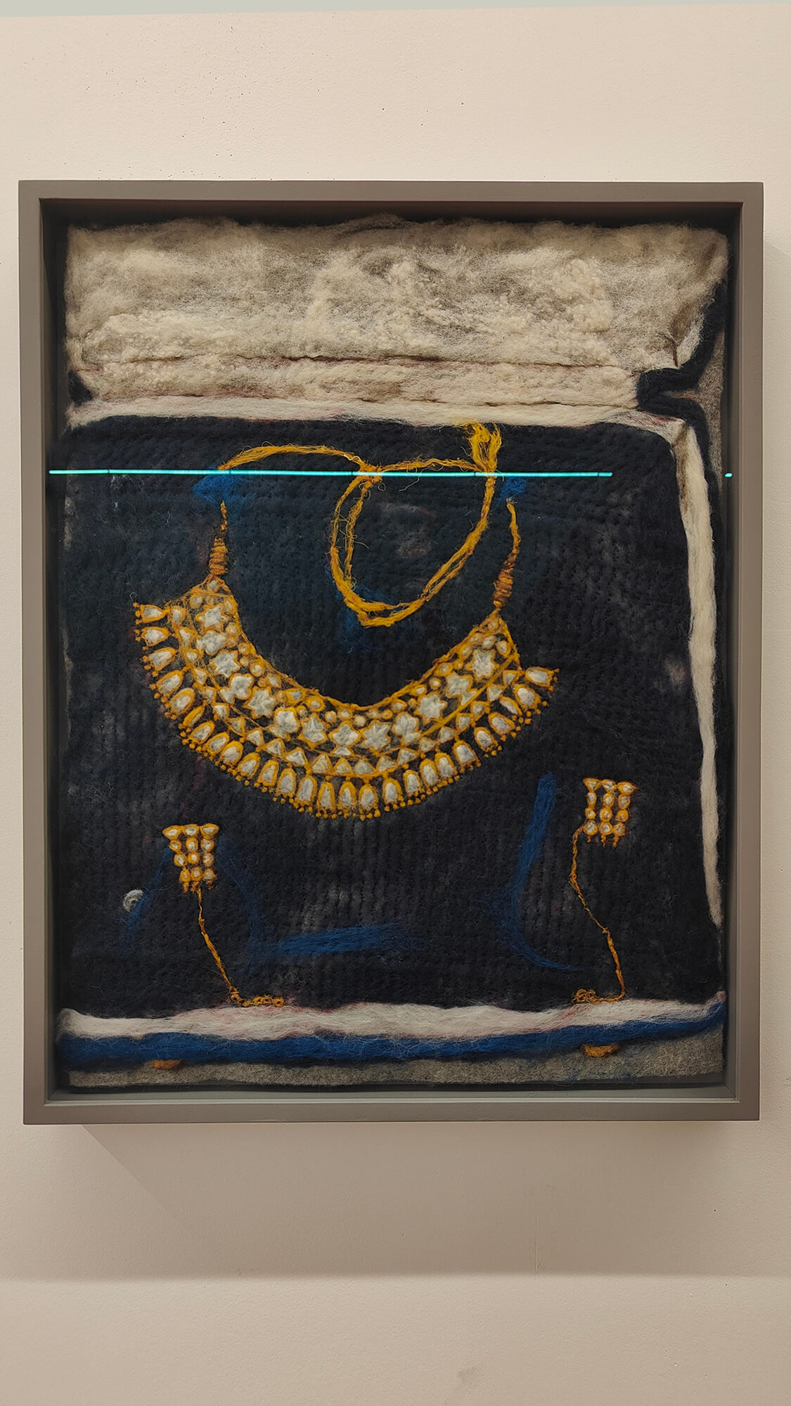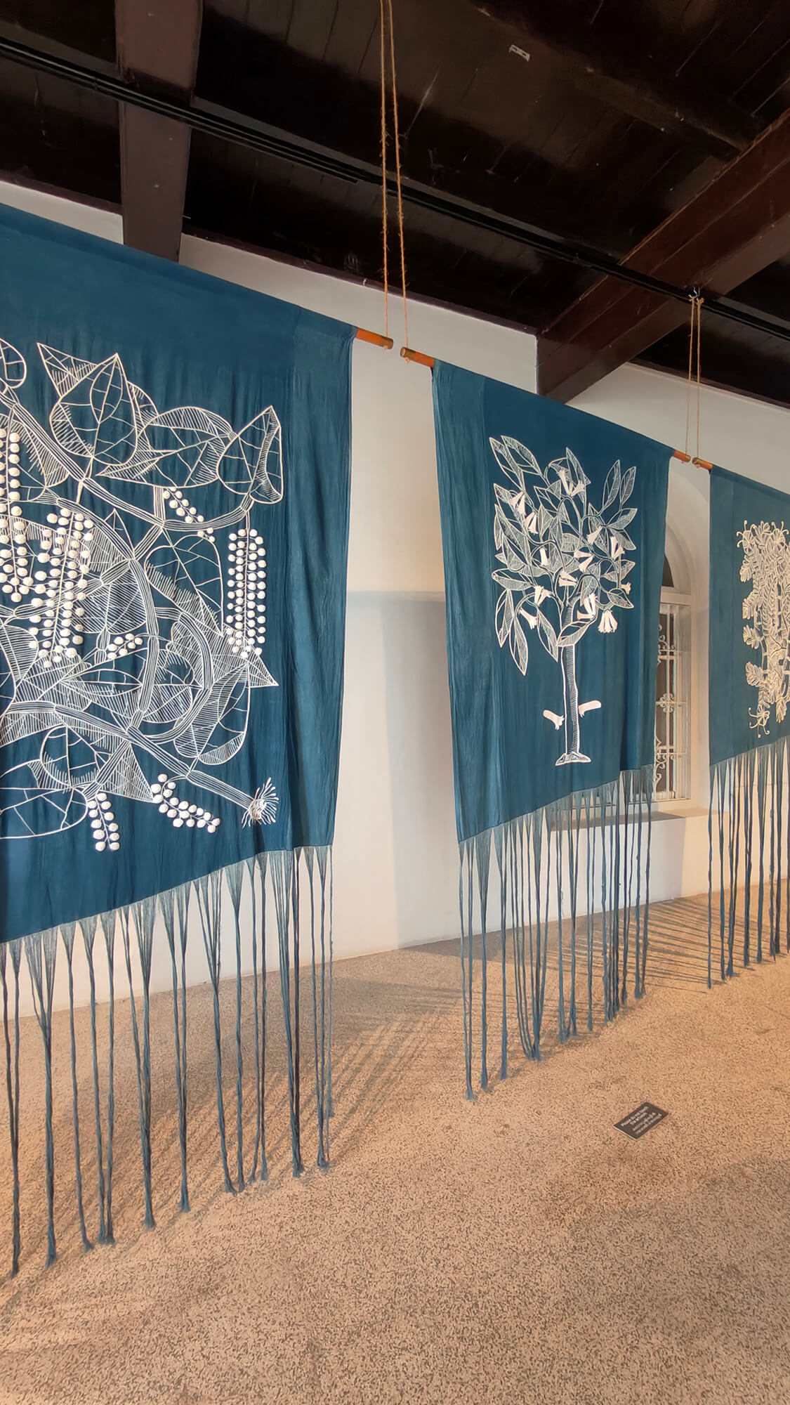 From there, we were led to one of the more engaging single displays, “Looming Bodies” by Lakshmi Madhavan. The artist has worked closely with handloom workers of Kerala, and this display focuses on the labour behind the craft rather than the final product.