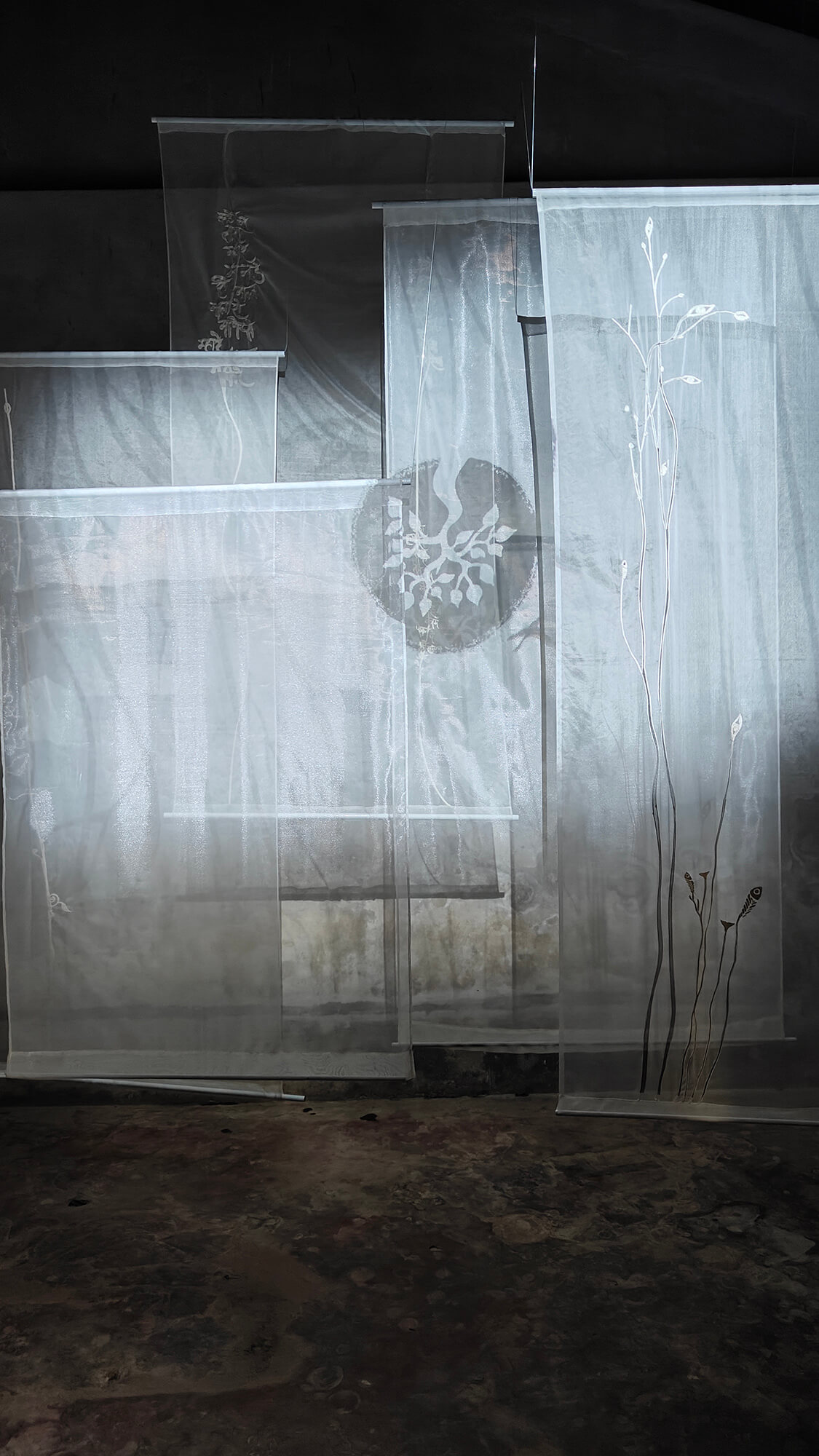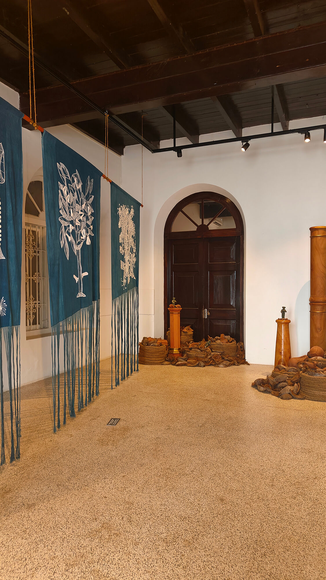One installation was placed in a space that opened directly to the sea, speaking about colonial trade through cotton fabrics and spice prints.