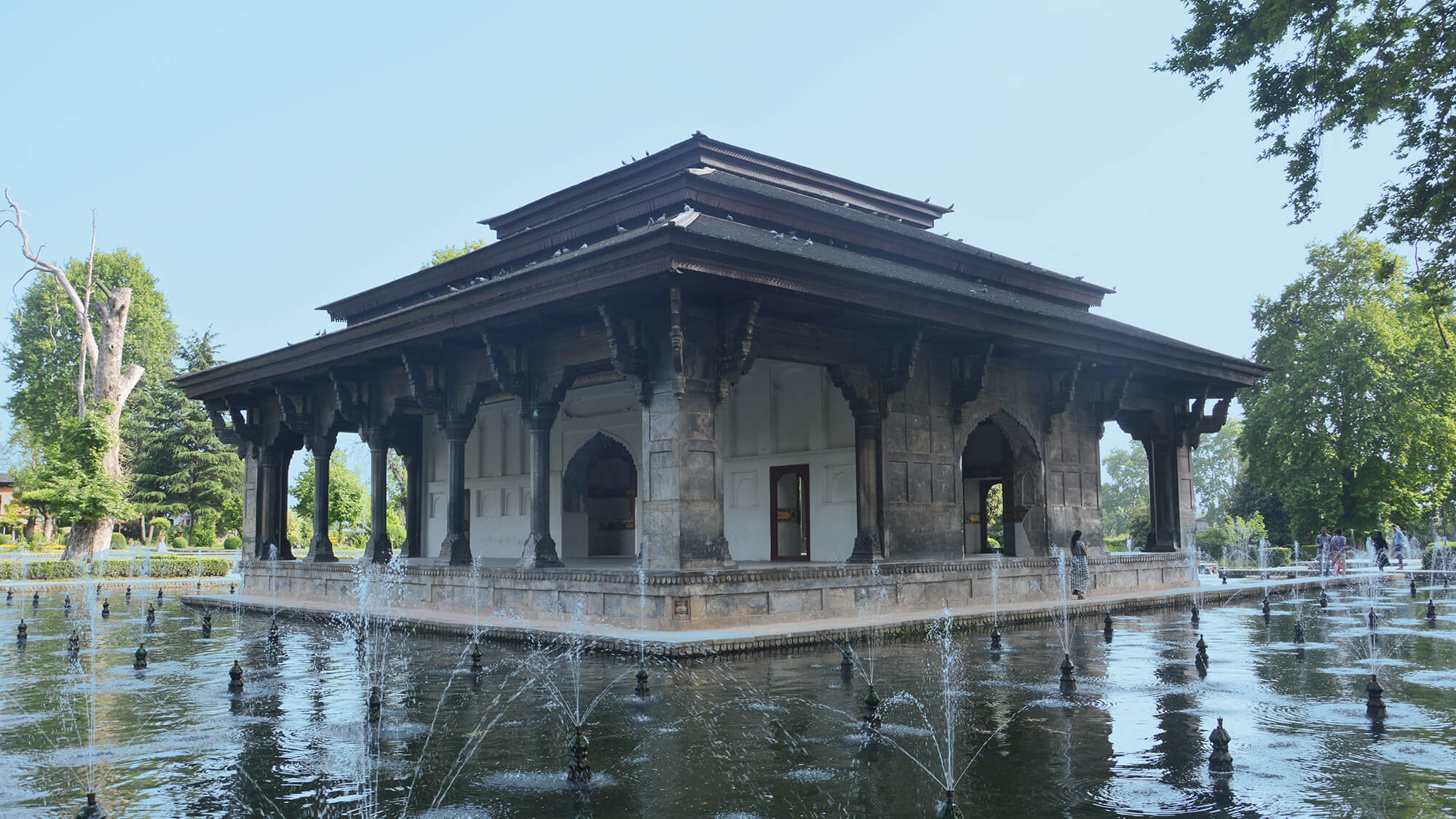 Further ahead, the Black Pavilion is surrounded by almost a thousand fountains on all sides. From here, one can see the precision of geometry, with fountains aligned perfectly along the central axis, connecting the entry pavilion to the zenana at the back.
